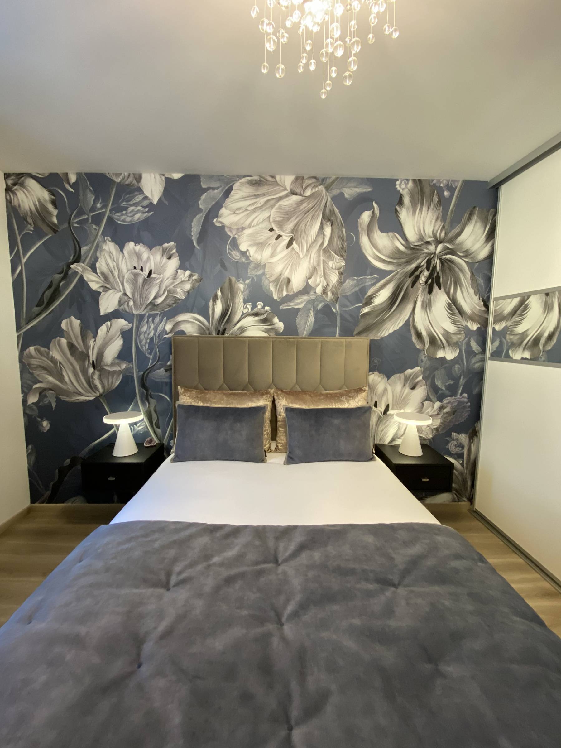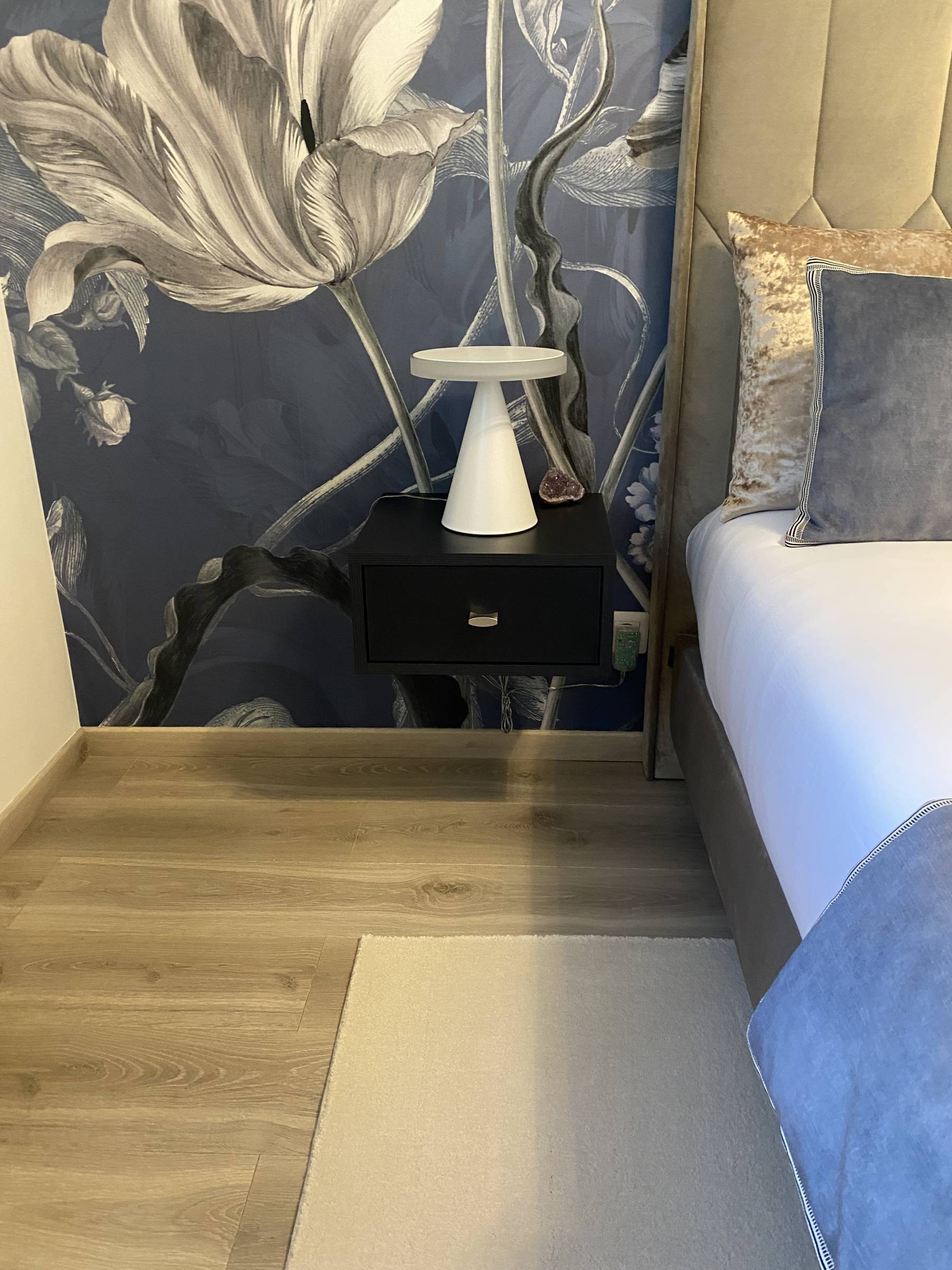 Par la suite, nos clients ont choisi leur tapisserie, et il ne restait plus qu'à embellir le tout avec des tables de chevets sur mesure. Nous avons créé un rappel de coloris des fleurs avec le noir que nous avons décliné avec un effet bois (noir élégant), légèrement soutenu afin de ne pas ajouter trop de motif à la pièce. Puis nous avons accessoirisé les tables en ajoutant des poignées en inox brossé pour faire ressortir le mobilier de coloris noir.