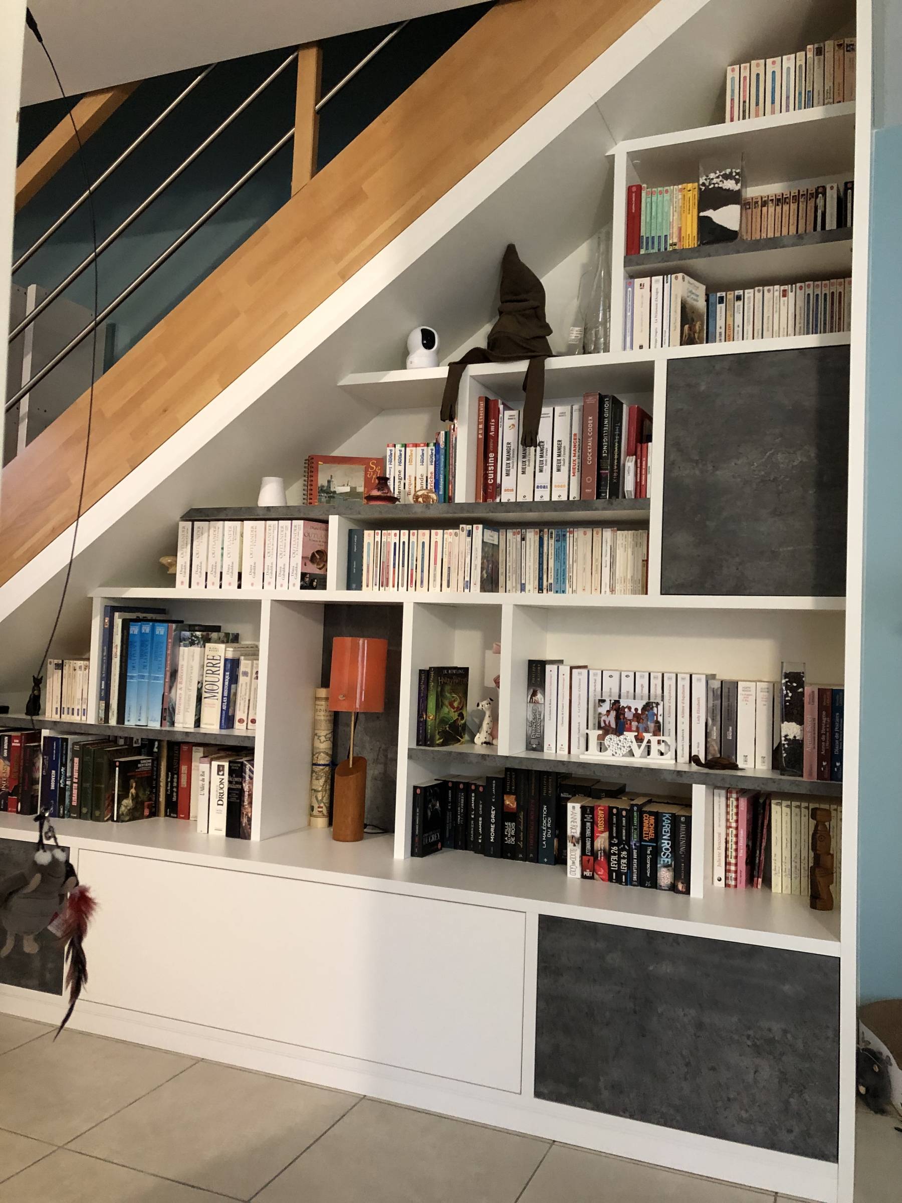 ✅ Que nous avons optés pour un meuble sur-mesure de faible profondeur 50cm cassant la profondeur totale de l’escalier avec un décroché intérieur pour la bibliothèque. Un esthétique déstructuré pour un effet contemporain et design est insufflé avec des chants de coloris béton lave sur 4 étagères horizontales, des étagères verticales à différents endroits et des niches fermés et ouvertes ;