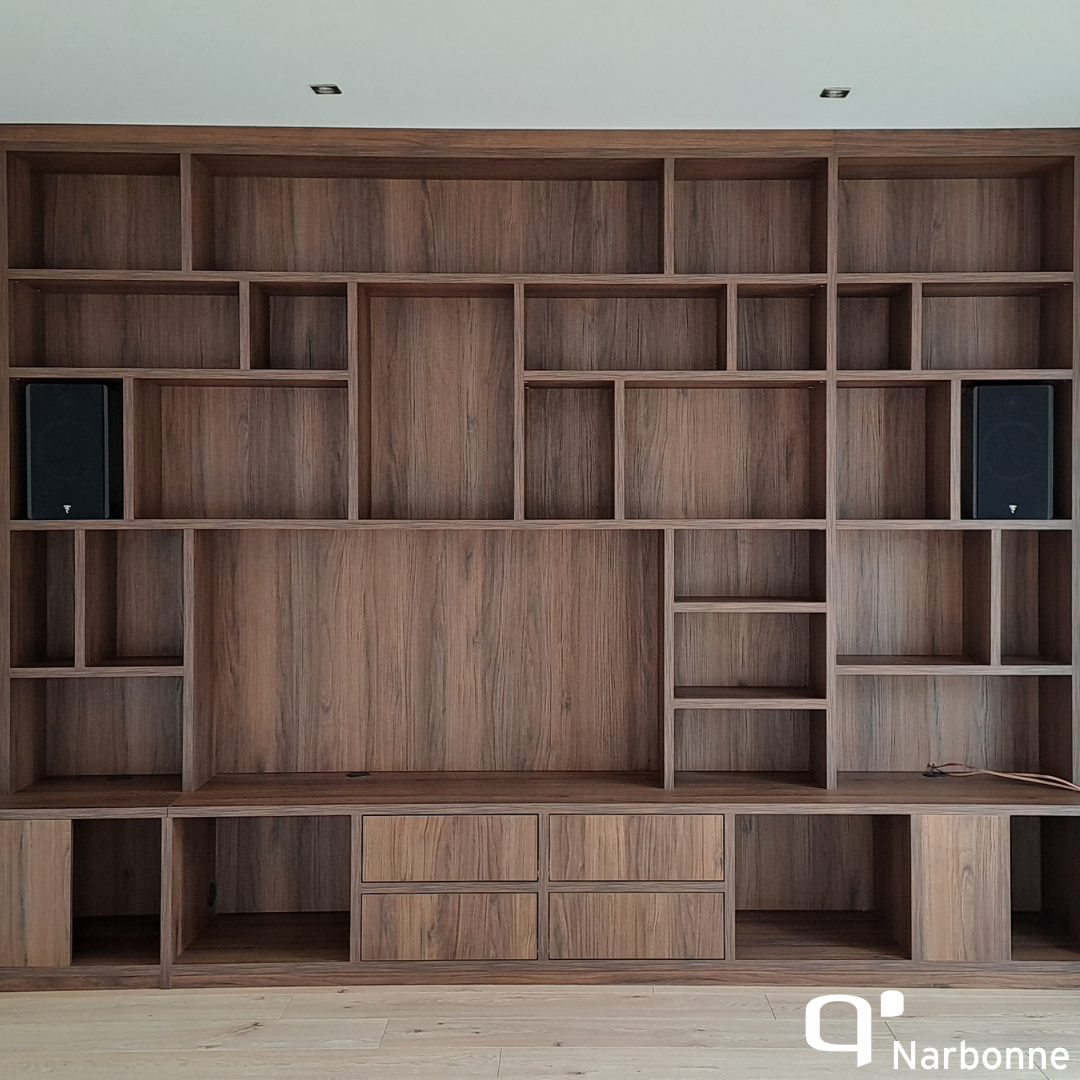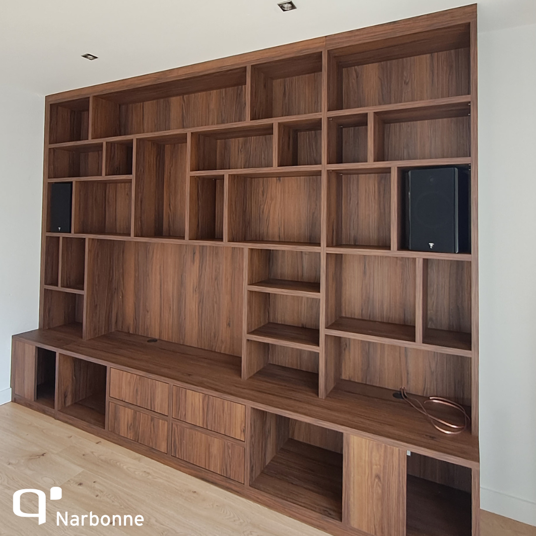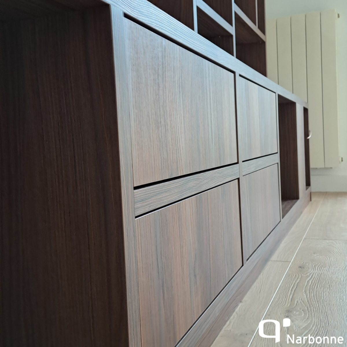 Imaginez un meuble living intégrant une partie basse fermée, un espace dédié à la télévision au-dessus et surmonté tout autour d’une bibliothèque sur-mesure comme chez notre client :