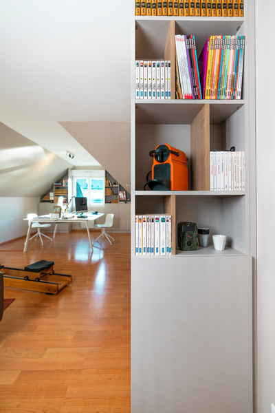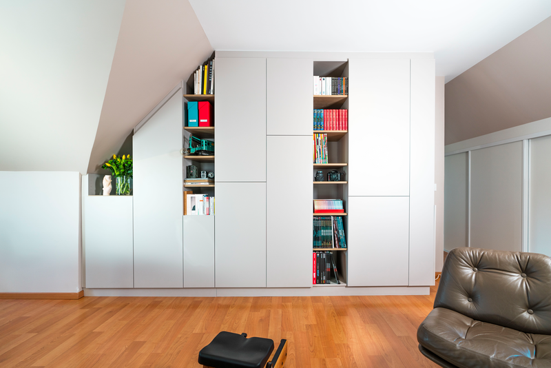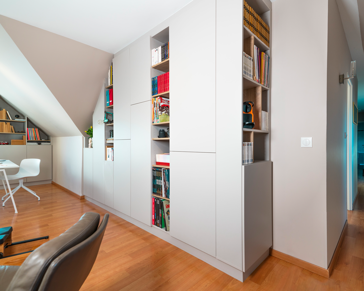 Un rangement sous escaliers sur mesure offre une solution pratique et design pour optimiser l’espace disponible. L’aménagement peut inclure des espaces fermés pour dissimuler les documents et du mobilier ouvert pour une mise en valeur d’objets décoratifs.