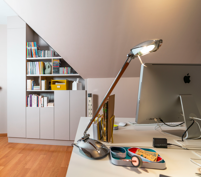 Un projet réalisé à Lézignan-Corbières a permis de transformer un dessous d’escalier en espace de stockage fonctionnel et esthétique. Tiroirs coulissants, placards fermés et niches ouvertes optimisent le rangement tout en s’intégrant harmonieusement au bureau. Chaque module a été conçu sur mesure pour s’adapter à la pente et offrir une capacité de stockage maximale.