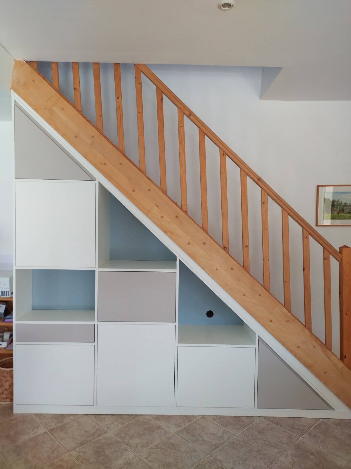 Avoir un escalier dans un salon est une contrainte technique dont on ne sait pas trop comment agencer son espace en-dessous... Sans réelle fonction et inexploité, le client souhaitait optimiser cet espace par un meuble sous-escalier sur-mesure fermé et ouvert pour ne pas avoir un effet massif.
