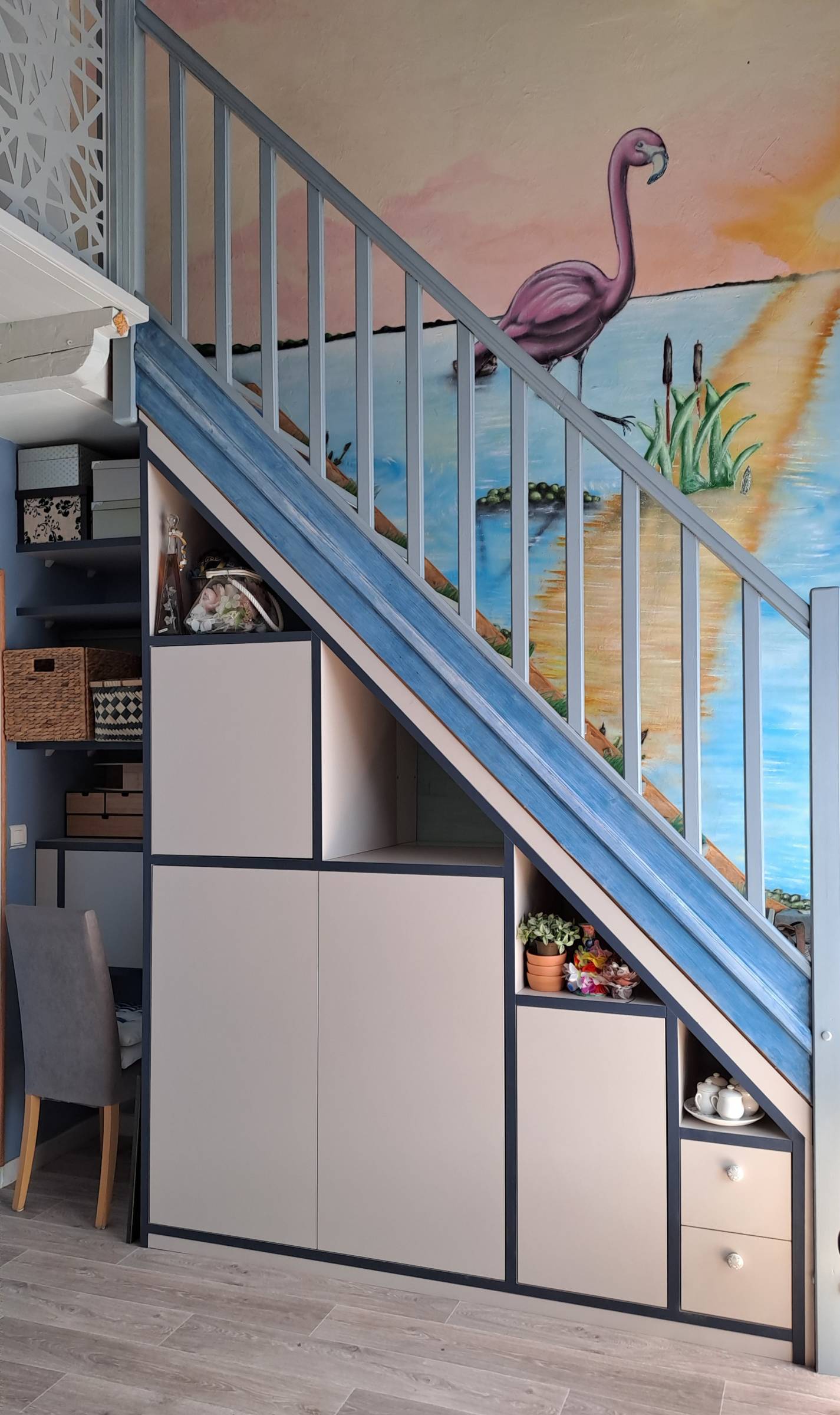 - Des espaces ouverts par des niches déco, des étagères et fermés pour tout leur rangement en exploitant la profondeur totale de leur sous-escalier. Le Résultat ? Un ensemble aéré et léger au regard et en proportion par rapport à la pièce.