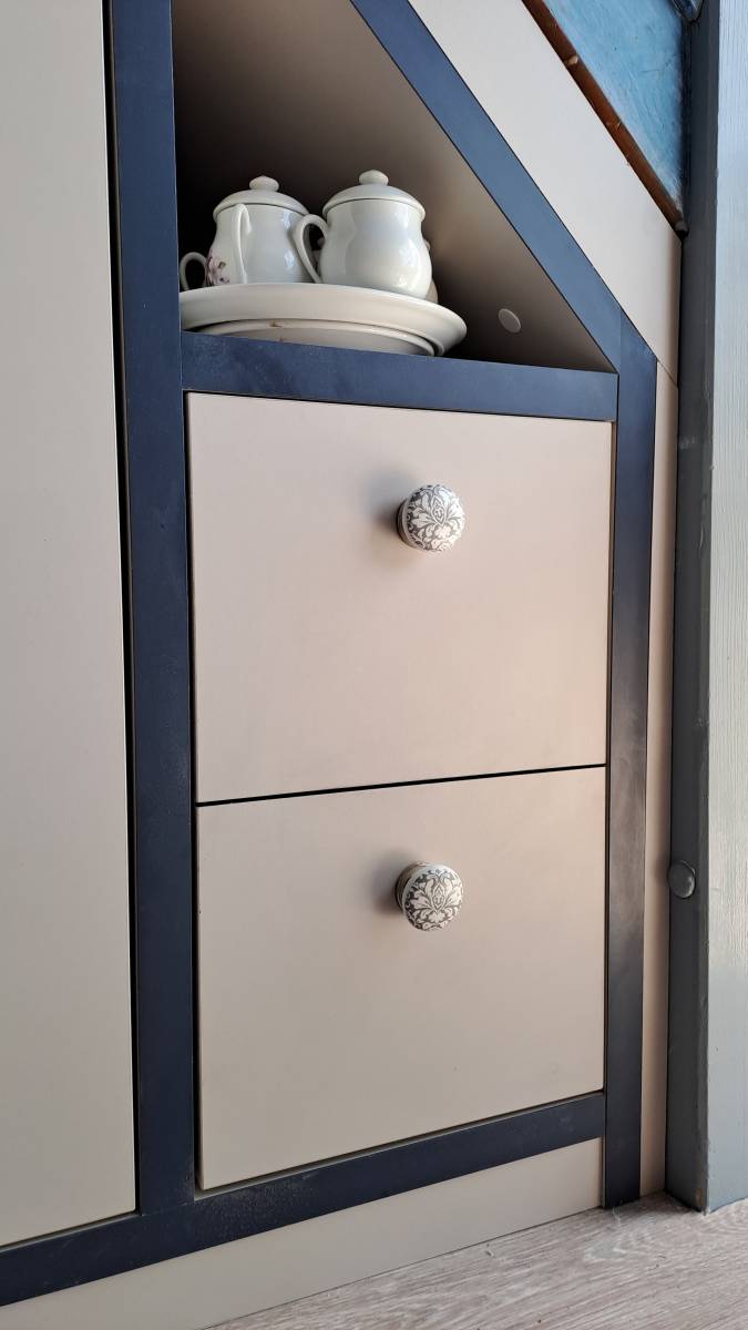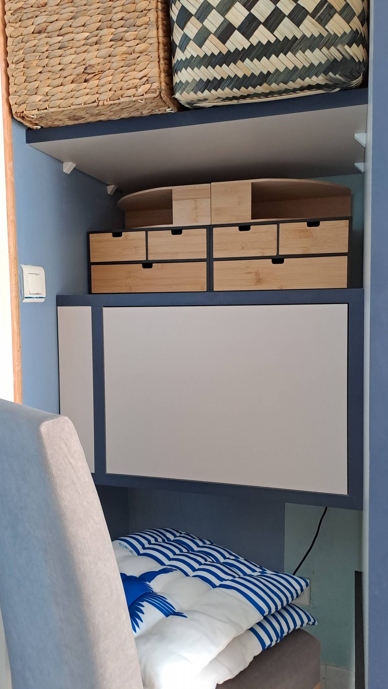 - 2 zones : 1 coin bureau pour travailler sous le palier de l’escalier et 1 coin rangement sous l’escalier pour leur stockage.